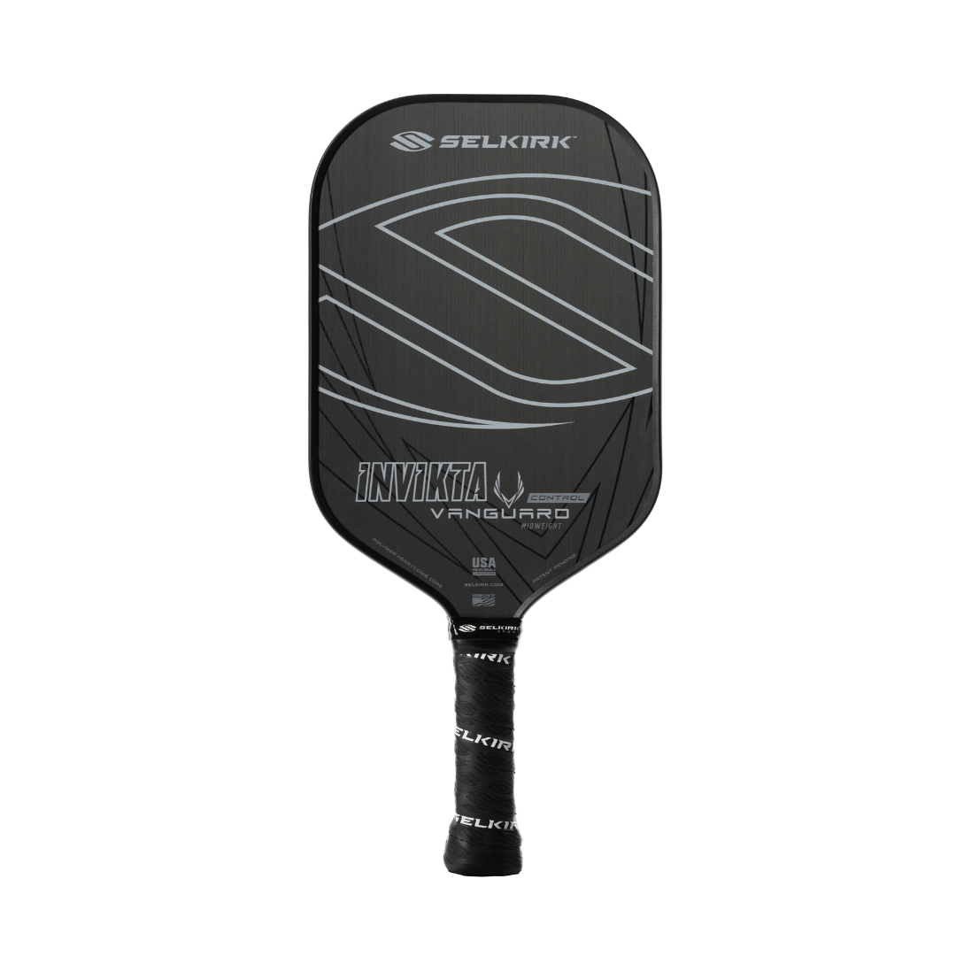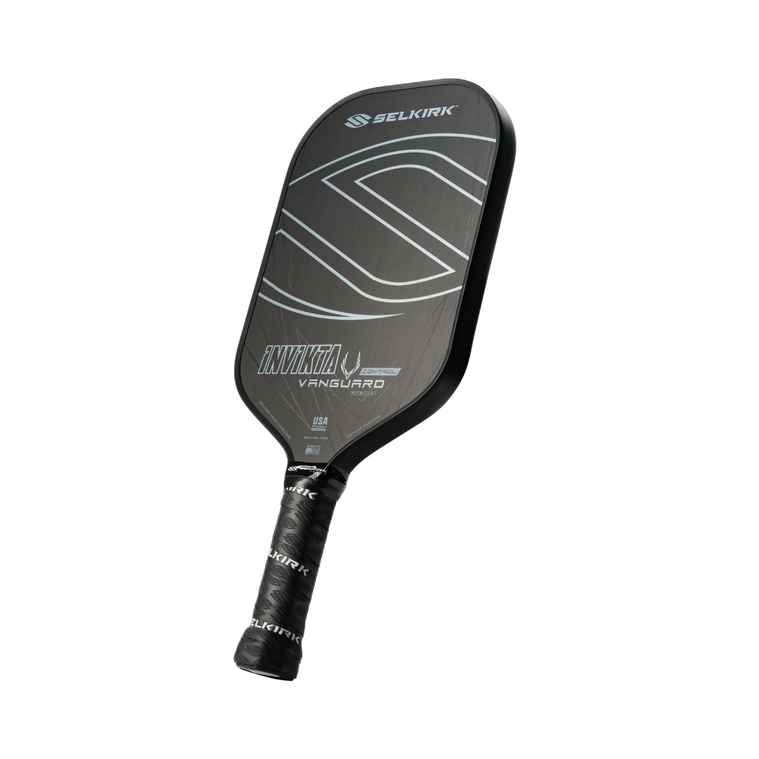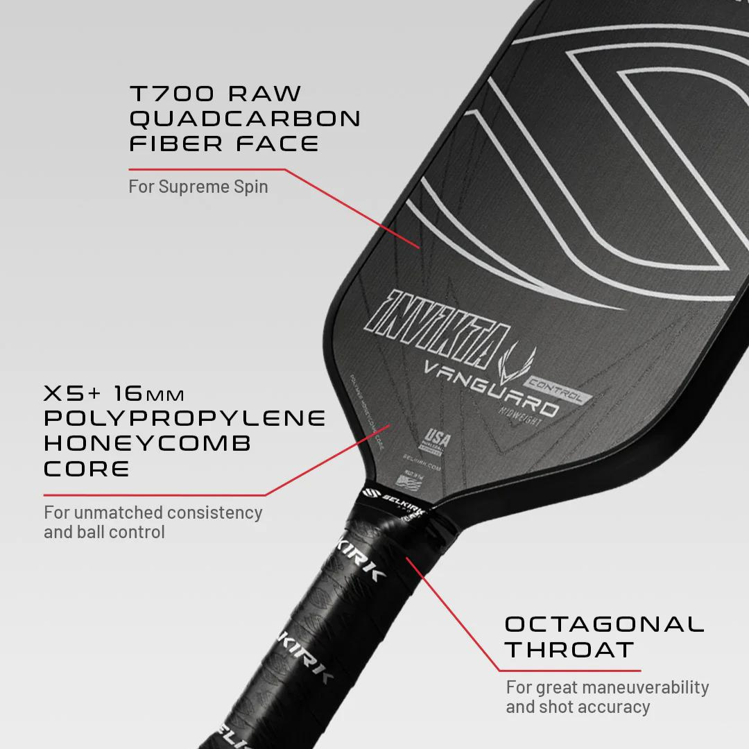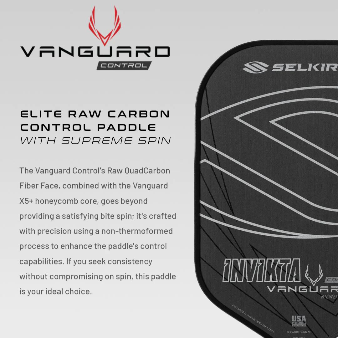 La raquette de pickleball Vanguard Control est une raquette en carbone brut d'élite qui permet une exécution sans effort de coups précis, y compris les chutes et les réinitialisations du troisième coup.